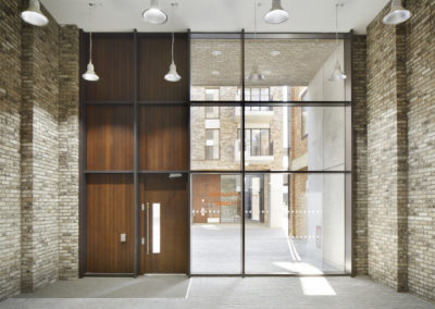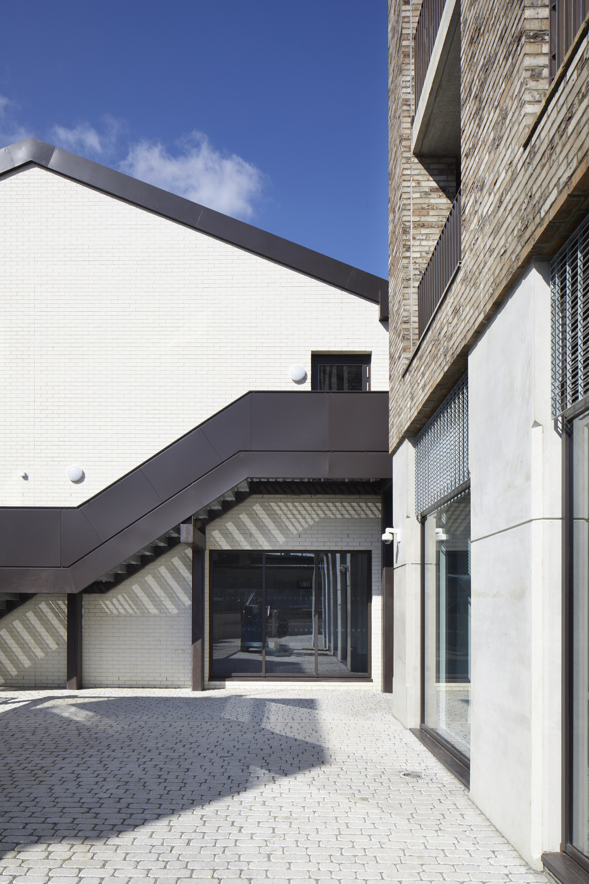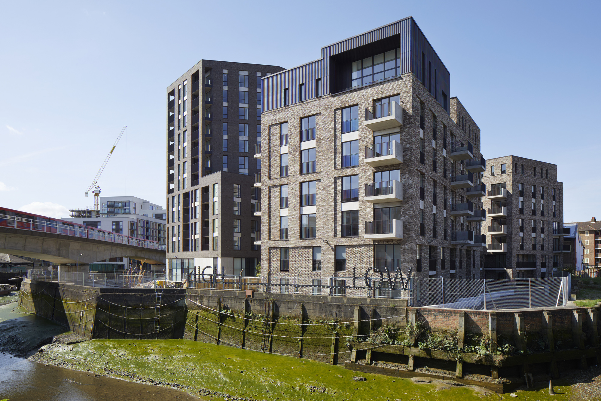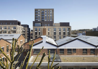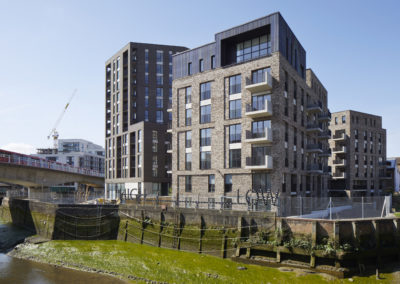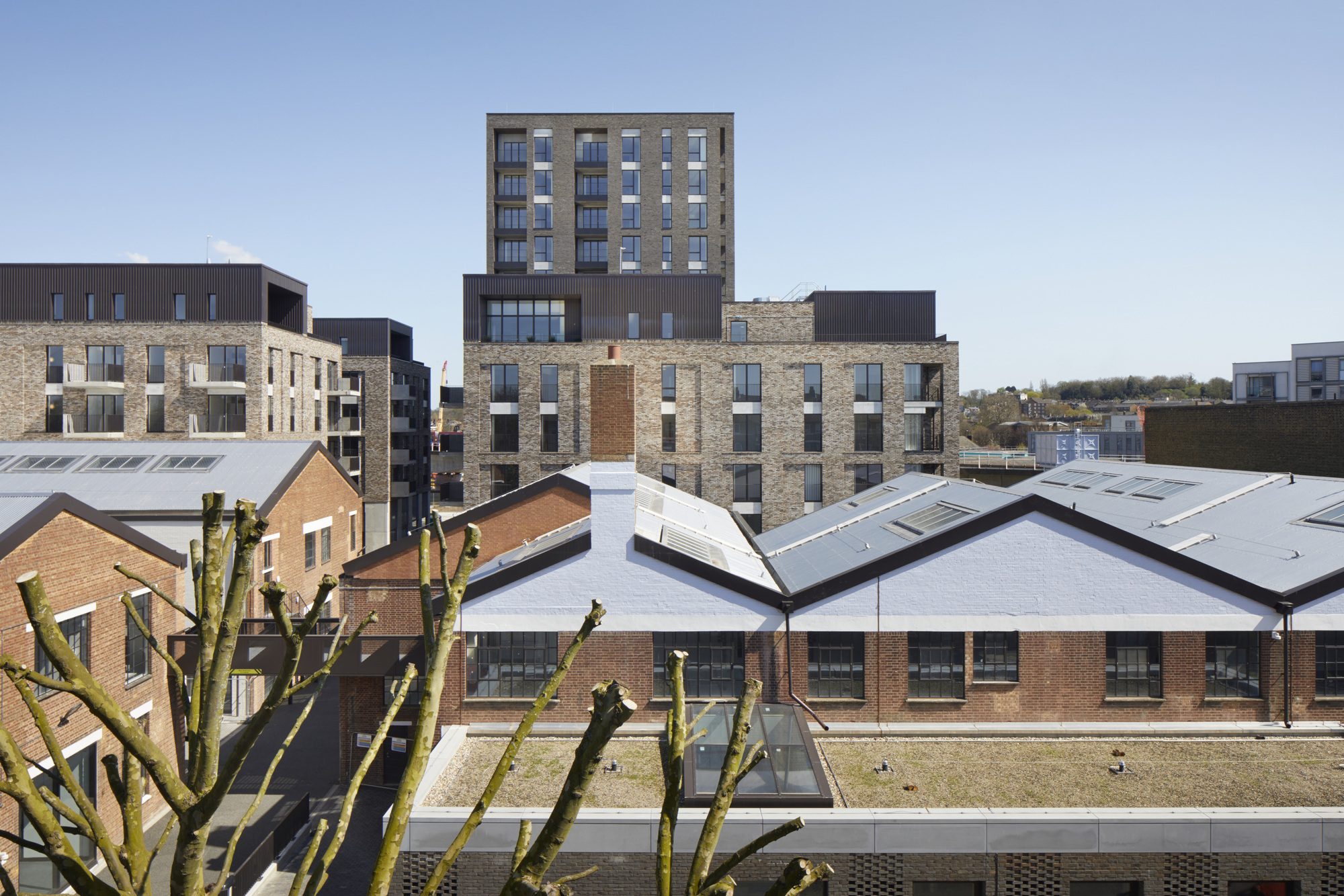The scheme included the restoration of two existing buildings and construction of four new residential buildings ranging from 6-12 storeys. The finished development provides flexible offices for commercial-space providers, Workspace, as well as affordable and market-rate rental units for L&Q Housing Association.