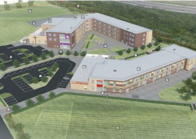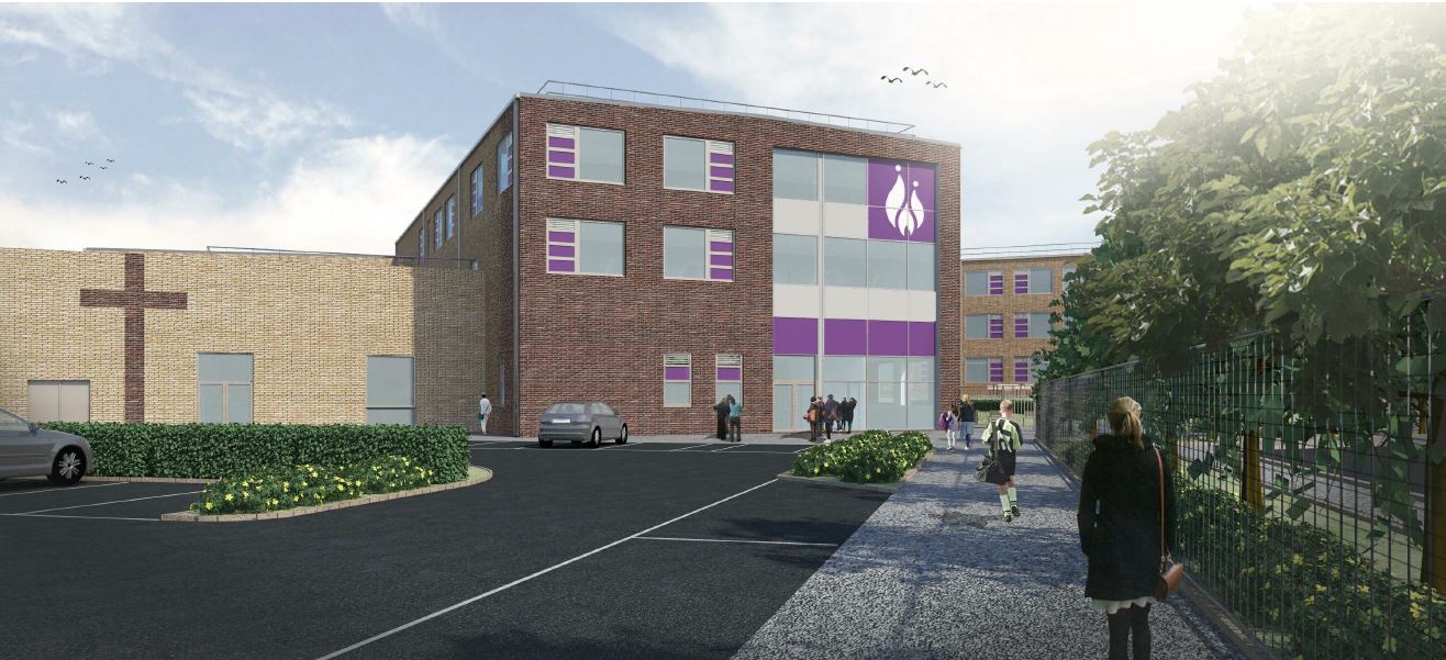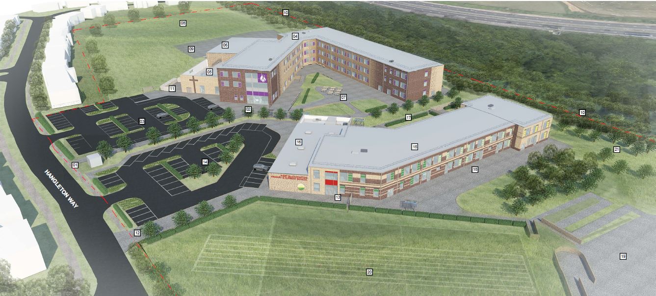 The scheme included the demolition of existing school buildings and the erection of a replacement primary school and nursery school (2 form entry) together with the erection of a secondary school (5 form entry) plus 6th form, including re-provision of sports pitches, provision of new access and parking and associated landscaping.