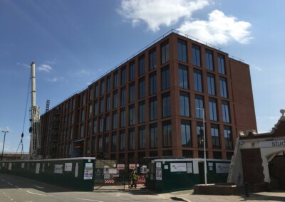 The proposed building will provide approximately 70,000ft2 (net internal area) of Grade A office space over five storeys, with staff welfare facilities, bicycle storage, parking for 10 cars accommodated within the footprint of the building at ground level, and screened plant.