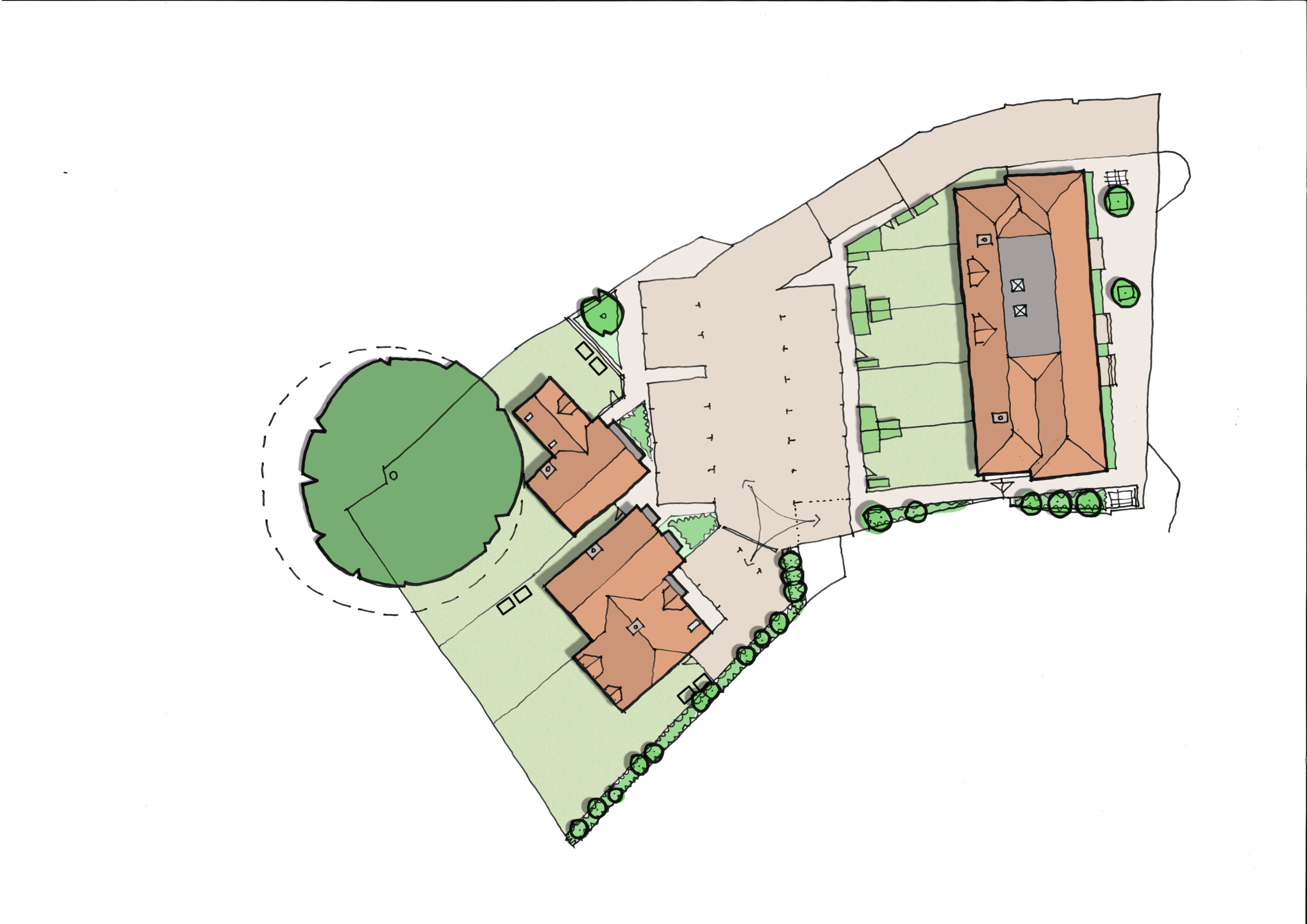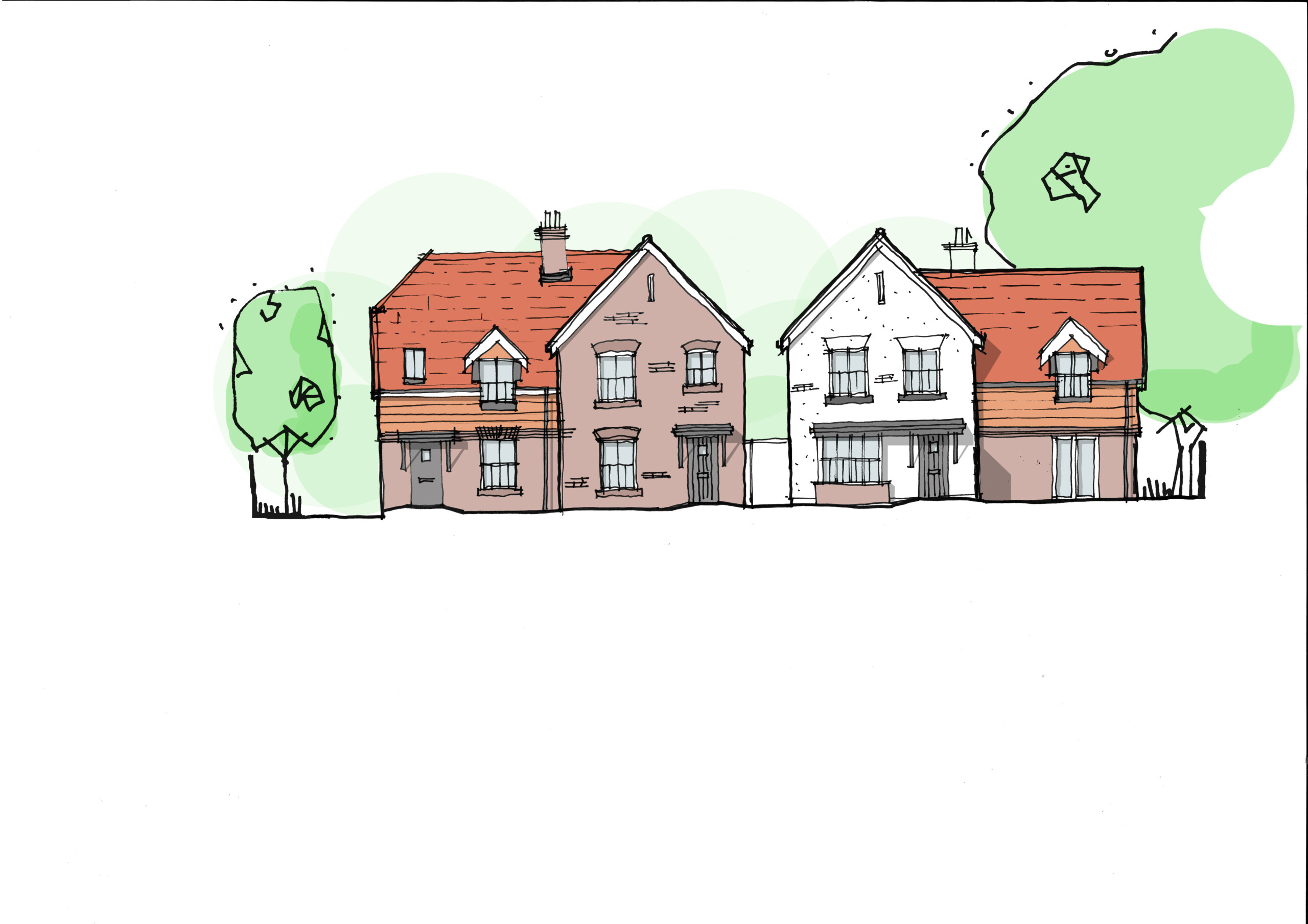 The development comprises 5 terraced, 1 detached and 2 semi-detached dwellings with associated landscaping, car parking, refuse space and access. The plans for this high-quality new build development include a new car parking courtyard, landscaped amenity space and the retention of the large Oak tree to the north east corner of the site.